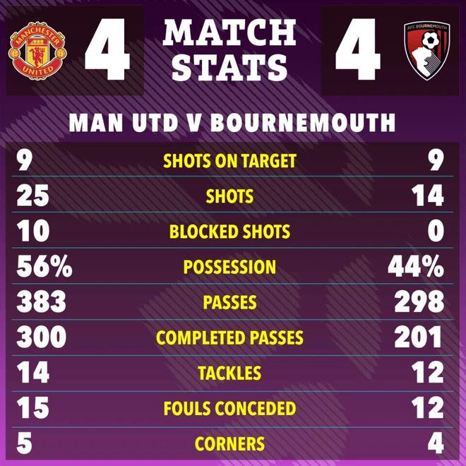 曼联自1984年10月以来,每当主场半场结束时领先,就从未输过比赛。但下半场刚开始不到60秒,曼联就丢球了。约罗造越位失败,埃万尼尔森接到队友的直塞单刀破门,曼联2-2伯恩茅斯。
